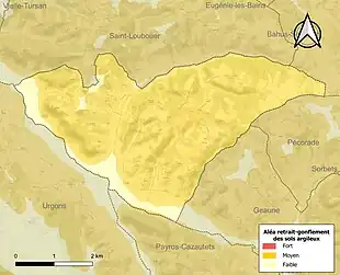 Le retrait-gonflement des sols argileux est susceptible d'engendrer des dommages importants aux bâtiments en cas d’alternance de périodes de sécheresse et de pluie. 91,2 % de la superficie communale est en aléa moyen ou fort (19,2 % au niveau départemental et 48,5 % au niveau national). Sur les 109 bâtiments dénombrés sur la commune en 2019, 108 sont en aléa moyen ou fort, soit 99 %, à comparer aux 17 % au niveau départemental et 54 % au niveau national. Une cartographie de l'exposition du territoire national au retrait gonflement des sols argileux est disponible sur le site du BRGM[19],[Carte 2].