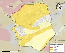 La commune est vulnérable au risque de mouvements de terrains constitué principalement du retrait-gonflement des sols argileux[22]. Cet aléa est susceptible d'engendrer des dommages importants aux bâtiments en cas d’alternance de périodes de sécheresse et de pluie. 59,3 % de la superficie communale est en aléa moyen ou fort (59,3 % au niveau départemental et 48,5 % au niveau national). Sur les 4 478 bâtiments dénombrés sur la commune en 2019, 2 224 sont en aléa moyen ou fort, soit 50 %, à comparer aux 85 % au niveau départemental et 54 % au niveau national. Une cartographie de l'exposition du territoire national au retrait gonflement des sols argileux est disponible sur le site du BRGM[23],[Carte 2].