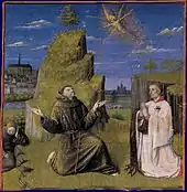 Heures à l'usage d'Angers | 1450 (vers ?) | Paris, Bibliothèque nationale de France, NAL 3211 | 285 folios reliés, 20,5 × 14,4 cm | Une miniature de la main de Jean Fouquet (La Stigmatisation de saint François, f. 241), les autres du Maître de Jouvenel. |