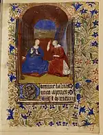 Heures de Jeanne de France | 1452 (vers) | Paris, BNF, NAL 3244[12] | 336 folios, 11 x 7,8 cm | 28 grandes miniatures et 37 petites par le Maître de Jouvenel et 2 miniatures attribuées à Jean Fouquet (Mise au tombeau, f. 263v. et Cruficifixion, 270v.) |