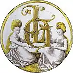 Monogramme LG | 1460 (vers) | Paris, musée national du Moyen Âge | Médaillon en verre blanc ; élément d'un vitrail | 20 cm (diamètre) | Fouquet en a sans doute fourni le patron. Interprété comme celui Laurent Gyrard, secrétaire et notaire du roi, gendre d'Étienne Chevalier |