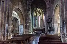 Nef centrale, chœur, transept et clocher datent des premières années du XIIIe siècle et constituent le premier essai d'adaptation d'art gothique en Pays d'Oc. Le campanile est du XVIe siècle, les nefs latérales et le deuxième étage du clocher sont du XVIIe siècle. Les premiers jeux du grand orgue remontent à 1629.