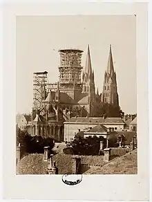 Dès le début du XIIe siècle, à la suite de l'incendie de l'édifice en 1105, lors du siège de la ville par Henri Beauclerc[7], sont entrepris d'importants travaux qui toucheront progressivement toutes les parties de l'édifice et se prolongeront jusqu'à la fin du XVe siècle par le couronnement de la tour centrale.