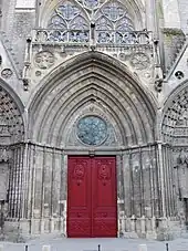 Une balustrade formée de quadrilobes inscrits dans un cercle surmonte le portail central. L'écoinçon de gauche figure un clerc à genoux, probablement un donateur. Au-dessus s'ouvre une grande fenêtre rayonnante, surmontée d'une galerie avec les statues de dix évêques, disposés deux par deux dans des baies géminées surmontées de gâbles décorés de trilobes et de roses aveugles. Un grand gâble couronne le tout, orné de crochets et décoré de roses aveugles[22].