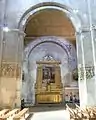 L'abside principale, voûtée en cul-de-four, présente un décor fait de cinq arcades aveugles avec colonnettes cannelées ou torsadées surmontées de chapiteaux à feuilles d'acanthe.