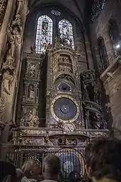 La cathédrale est rendue au culte catholique en 1801 et la réparation des dégâts commence en 1806. Tout au long du XIXe siècle, les sculpteurs Jean-Étienne Malade, Jean Vallastre, Philippe Grass et Louis Stienne se succèdent pour remplacer les statues n’ayant pu être sauvées lors de la Révolution[64]. Outre la statuaire, l’architecte Gustave Klotz entreprend à partir de 1839 un important travail de réorganisation et de restauration des vitraux ; il fait également retirer en 1848 le badigeon qui couvrait les murs intérieurs et remettre l’horloge astronomique en état de marche par Schwilgué[65].