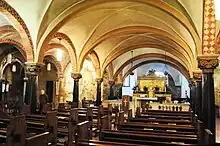 La façade, en brique, est asymétrique. Elle est dans un style roman typique, exception faite du portique, grande entrée de style gothique soutenue par de petites colonnes avec des sculptures léonines à la base.