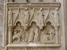 Les niches des soubassements abritent des statuettes décapitées au XVIe siècle par les Huguenots et non identifiables. La partie inférieure des soubassements est sculptée de bas-reliefs sous forme de médaillons. Ceux-ci constituent de superbes et délicats petits chefs-d'œuvre de la sculpture du Moyen Âge (XIIIe siècle). On y trouve l'histoire de Joseph à gauche et la parabole de l'enfant prodigue à droite. Certains de ces bas-reliefs comportent des personnages liés à l'antiquité païenne : on y voit notamment un Éros endormi, un jeune satyre, un Hercule.
