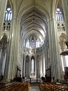 La nef ainsi que le chœur comportent cinq vaisseaux (comme à Paris). Le vaisseau central est longé de part et d'autre par deux bas-côtés ou collatéraux. Ce n'est qu'au niveau de l'abside que le déambulatoire se réduit à un seul vaisseau en demi-cercle, lequel fait suite au déambulatoire interne de la partie rectangulaire du chœur, la partie externe de ce dernier étant remplacée par les chapelles rayonnantes au nombre de cinq.