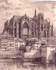- Dom Augustin Calmet, « Cathédrale de Metz. Plan, élévation », dans Histoire ecclésiastique et civile de Lorraine, qui comprend ce qui s'est passé de plus mémorable dans l' archevêché de Trèves, et dans les évêchés de Metz, Toul et Verdun, depuis l'entrée de Jules César dans les Gaules jusqu'à la mort de Charles V, duc de Lorraine, arrivée en 1690, chez Jean-Baptiste Cusson, Nancy, tome 3, 1728, planches VI et VII (lire en ligne)