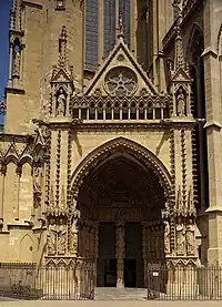 À cette occasion, et dans un souci d’harmonisation de cet ensemble urbain, Blondel construit sur les trois côtés de la cathédrale ainsi dégagée, une enveloppe classicisante. Un sobre et majestueux portail principal est construit en 1764 du côté de l'évêché[33] (actuel marché couvert. Le portail de la Vierge qui donnait accès à la collégiale Notre-Dame-la-Ronde est dissimulé par les arcades classiques, sous lesquelles ouvrent des échoppes [Note 2].