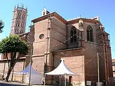 Le clocher de style gothique toulousain s'inspire fortement de celui des Jacobins de Toulouse : imposante et briquetée, la tour octogonale est éclairée à chaque étage de fenêtres géminées terminées par un arc en mitre. Elle remonte au XIVe siècle. On pourra remarquer les créneaux et les meurtrières, témoignant du passé houleux de la ville.