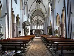 - un jubé avec autel devant le presbytère (1684), qui a été construit à l'emplacement d'un jubé médiéval en brique, une belle grille (1685) vers le XIIIe siècle. fonts baptismaux en pierre[3],
