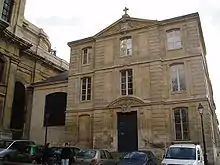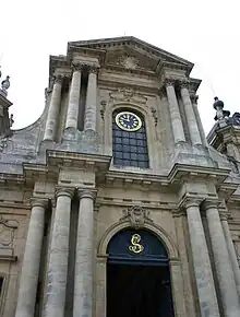 Un fronton triangulaire sommé d'une croix dorée surmonte la façade. Il s'orne du blason royal ailé dont les fleurs de lys ont été supprimés à la Révolution. On en devine encore l'empreinte.