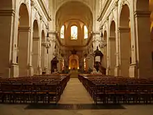Longue de 93 mètres, haute de 23, la nef est couverte d'une voûte à pénétration dont les doubleaux atteignent près d'un mètre d'épaisseur. La voûte des collatéraux retombe sur des piliers agrémentés de pilastres doriques reposant sur des dosserets qui accentuent le ressaut.