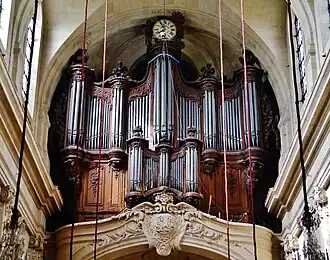 Au-dessus de l'entrée, au revers de la façade, la tribune d'orgue est portée par un grand arc en anse de panier retourné, inspiré de la tribune des musiciens de la grande salle du château de Maisons-Laffitte par François Mansart. L'orgue est l'œuvre des Clicquot. Au-dessus des arcades, l'église est éclairée par des baies à vitraux peints en grisaille pour apporter plus de lumière, selon un procédé courant aux XVIIe et XVIIIe siècles.