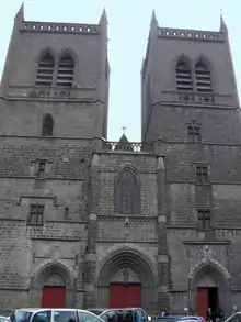 La couleur de la pierre basaltique et le caractère massif des deux tours carrées percées de quelques fenêtres à meneaux donnent à la cathédrale une allure de château fort et à la façade symétrique une certaine austérité, en contraste avec les richesses de son patrimoine intérieur.