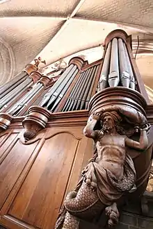 Le massif du grand-orgue est composé de trois niveaux de panneaux moulurés, carrés au niveau inférieur, rectangulaires horizontaux au niveau médian et rectangulaires verticaux au niveau supérieur. Les moulures des panneaux de ce niveau, les plus proches des grandes tourelles latérales sont incurvées vers le haut et celles des panneaux du centre vers le bas, laissant la place aux culs de lampe des tourelles centrales.