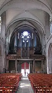 La nef s'étend sur six travées dont la première constitue le narthex. Achevée en 1475, elle est couverte d'une charpente de bois construite vers 1479-1480. Cette charpente a une architecture en chevron formant ferme (chevrons en chêne de quatorze mètres). Devant recevoir une voûte de pierre, elle est, sans doute faute de financement, remplacée par une charpente d'un lambris de lattes de bois en 1626-1627[12] (lattes constituées de bois de tonneaux démontés, des bois de merrain)[13].