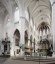 La construction de l'église a commencé peu après 1200 ; elle a été consacrée en 1312, dès qu'une partie est devenue utilisable. À partir de 1324, les arcs-boutants et la structure du chœur sont construits selon des caractéristiques gothiques brabançonnes, différentes du gothique français. Après l'incendie de la ville en 1342, le maître-maçon Jean d'Oisy dirige les réparations et poursuit la deuxième phase de construction jusqu'à sa mort en 1375. Ses successeurs achèvent les voûtes de la nef vers 1437 et celles du chœur vers 1451[1],[2],[3],[4].