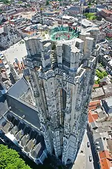 Son impressionnante tour - qui suscitait l'admiration de Vauban - est haute de 97,3 mètres et abrite deux carillons. Elle fait partie d'un groupe de 56 beffrois et clochers de Belgique et de France inscrits sur la liste du patrimoine mondial ID 943-016 de l'UNESCO.