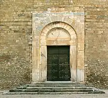 Au-dessus du portail, on trouve une petite baie cintrée, encadrée par un décor de bandes lombardes.