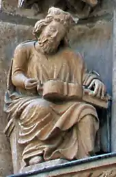 Portail du Sarmental (Portail du serment). Les voussures illustrent la Cour céleste et le tympan, construit avant 1240, est de fort belle venue : remarquer la variété des attitudes des quatre évangélistes écrivant sur leurs tréteaux. Jésus en majesté et enseignant l’Évangile rappelle le Beau Dieu d'Amiens.