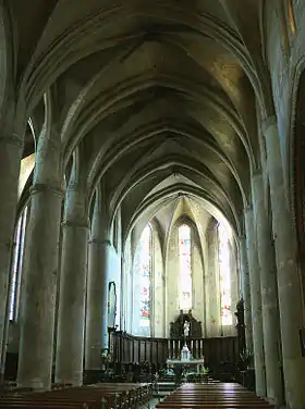 Grande nef et orgue. On constate la différence de largeur de la nef entre la première travée avec la tribune d'orgue et les suivantes et une fausse pile à gauche