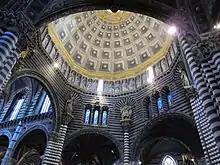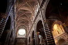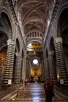 L'intérieur est divisé en trois nefs par des piliers polystyles, avec un transept à deux nefs (quatre si l'on considère les chapelles) et un chœur profond. En tout, l'intérieur mesure 89 m de long, 24 m de large aux allées et 54 m à la croisée[12]. La croisée du transept est constituée d'un hexagone surmonté du dôme à base dodécagonale, parmi les plus grands au moment de sa construction. Le plan est divisé en de nombreuses baies, carrées dans les bas-côtés et rectangulaire dans la partie centrale, à la manière des cathédrales gothiques françaises, le tout soutenu par des piliers et des arcs en plein-cintre très légers. Les voûtes, décorées d'un bleu étoilé, sont croisées dans l'ensemble des nefs[12]. La claire-voie est placée très haut, décorée d'arcs en ogives et constituée de fenêtres à trois ouvertures ajourées, avec des meneaux dans le transept. Deux magnifiques rosaces illuminent la contre-façade et le chœur. À l'extérieur, quatre grands contreforts compensent la poussée des voûtes du chœur. Toute la structure interne est dominée par l'alternance du noir et du blanc, en référence aux couleurs des armoiries de Sienne et créant un effet raffiné de clair-obscur.