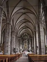 L'église du Moyen Âge s’élevait sur les restes d'une basilique paléochrétienne du Ve siècle : la structure gothique fut complétée en 1517 par l'érection d’un clocher de style gothique tardif de 65 mètres, sur les plans de l'architecte Burkhard Engelberg d’Augsbourg[3]. Remonte à la même période la chaire de style gothique tardif en grès, sculptée par le Souabe Hans von Schussenried ; partiellement détruite en 1943 par les bombardements alliés, elle a été reconstruite en 1949.