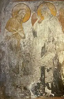 Sur la partie basse des murs, sont représentées deux scènes. Selon Victor Lazarev, elles relèvent d'une autre main que celle de Roublev et probablement celle d'un peintre de génération antérieure[5]. À gauche, sur le pilier nord est représenté un ange présentant la charte monastique à Saint-Pacôme et, à droite au sud , une conversation entre Barlaam et Josaphat. Ces deux sujets ont un intérêt particulier. Ils montrent quelle grande attention les constructeurs d'églises et leurs contemporains accordaient aux thèmes de la vie monastique. Même si l'intérêt pour ce type de vie était déjà caractéristique de l'ancienne culture russe, le fait de placer ici ces deux scènes près de l'autel est un témoignage tout à fait particulier de cet intérêt. C'est d'autant plus particulier que la cathédrale de la Dormition n'était pas une église de monastère mais l'église d'une ville princière. Dans la scène dans laquelle l'ange qui remet à Saint-Pacôme la charte du cénobitisme, considérée comme d'origine divine, les personnages sont représentés en habit monacal. La scène de la conversation entre Barlaam et Josaphat est traitée de manière chrétienne quant à son inspiration spirituelle, malgré l'origine bouddhiste du récit. Sur le parchemin déroulé dans les mains de Barlaam sont écrits ces mots : « Sois convaincu, mon enfant, quelle perle inestimable représente le Christ… » Ce sujet rappelle les relations qui existaient entre Iouri de Zvenigorod et son père spirituel Savva Storojevski.