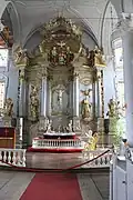 La cathédrale a un autel de 13 mètres de haut, un confessionnal, une chaire, au deuxième étage se trouve la loge des ducs de Courlande. La cathédrale se distingue particulièrement par son orgue à 131 jeux, 4 claviers et plus de 7 000 tuyaux, ce qui en fait le plus grand orgue mécanique du monde jusqu'en 19681968[2]. C'était le premier grand orgue mécanique en Lettonie et il a été fabriqué par Heinrich Andreas Contius en 1779[3],[4],[5].