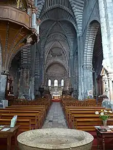 Sont admirables les grandes orgues offertes par le roi de France Louis XI, le maître-autel « à la romaine » en marbre polychrome[6] du XVIIIe siècle, les stalles du chœur des XVe et XVIe siècles, la rosace du XVe siècle et ses trois oculi, les autels de bois sculpté ou doré, les sculptures, les statues et les fresques.