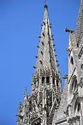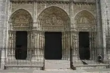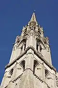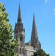 À la Renaissance, divers aménagements sont opérés. Le , la flèche de bois recouverte de plomb qui surmonte la tour nord disparaît dans un incendie allumé par la foudre. Les chanoines chargent l'architecte Jehan de Beauce de reconstruire entièrement en pierre le « clocher Neuf » dans le style gothique flamboyant, travail achevé en 1513. Le même architecte entame la construction en 1514 de la clôture de chœur dont la réalisation s'étend sur deux siècles[30] et érige en 1520 le pavillon de l'horloge de type Renaissance, structure extérieure devant la première travée du côté septentrional de la nef[31].