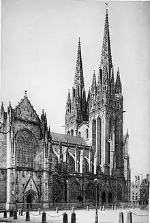 Sous l'impulsion de Joseph-Marie Graveran, gagné aux reconstitutions d'Eugène Viollet-le-Duc, une importante campagne de restauration, qui dure plusieurs décennies est confiée à l'architecte diocésain Joseph Bigot. Joseph-Marie Graveran décide notamment de reprendre le projet des flèches qui avait été ébauché sous l'épiscopat de Claude de Rohan au XVIe siècle. Il impose aux fidèles le « sou de saint Corentin », consistant pour chaque habitant du diocèse à donner un sou par an, pendant cinq ans, pour financer les travaux[22] d'un coût de 150 000 francs[23]. Les flèches néo-gothiques sont dressées en 1854 par Bigot ; elles sont réalisées de 1854 à 1856 par le maître-maçon Pierre Nestour et le tailleur de pierres Corentin Quéré[24]. En parallèle, le peintre-verrier Émile Hirsch réalise pour l'édifice jusqu'en 1875 23 verrières, toujours sous la direction de Joseph Bigot[25].