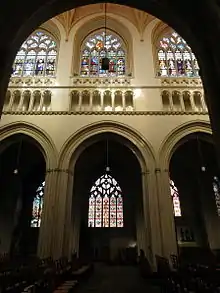 Le maître d'œuvre rompt avec la mode anglaise qui superposait une élévation à trois étages avec des grandes arcades, un haut triforium à arcades géminées et des fenêtres peu élevées. Il choisit une élévation à trois niveaux dans la nef, mais avec des grandes arcades en ogive surbaissée, une double galerie composée d'un court triforium en bande (la longueur des travées étant inégale, le triforium[49] comporte cinq ou six arcs brisés à réseau d'intrados trilobé) et d'une galerie supérieure (le garde-corps de cette galerie étant ajouré de six ou sept quadrilobes), enfin des fenêtres trois fois plus hautes que le triforium. L'élévation dans les quatre travées du chœur diffère par un triforium et une galerie de circulation qui sont placées devant les fenêtres hautes[50].