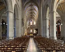 L'intérieur présente une ampleur certaine et une grande harmonie. L'architecte Chenavard a en effet réussi à unifier les parties anciennes gothiques du chœur avec la nef nouvellement construite. La décoration est sobre, les chapiteaux sont tous identiques et une coursière fait le tour de l'édifice.