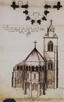 Grâce à des documents antérieurs à la destruction de l'abside orientale, on peut aujourd'hui imaginer avec précision son élévation extérieure[20]. Cette abside comportait comme l'abside occidentale deux niveaux de fenêtres mais à l'instar de cette dernière les deux niveaux donnaient sur la partie extérieure de l'abside, et les fenêtres les plus amples étaient les fenêtres basses[21]. D'autres monuments de l'époque proposent le même type d'absides à deux niveaux de fenêtres, tel que la cathédrale Saint-Lazare d'Autun, ou encore l'abbatiale de Payerne.