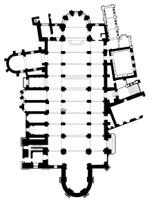 Deux de ces dernières soulignaient du côté oriental la travée qui était encadrée de deux tours et la troisième située au centre de la nef marquait de façon visible la coupure entre le chœur des chanoines situé à l'ouest avec l'espace réservé aux laïcs à l'est[18]. Les deux parties de la nef comptaient chacune douze colonnes disposées selon une symbolique du Moyen Âge censée représenter les douze apôtres et les douze prophètes, piliers de l'église au sens propre comme au sens figuré[18].