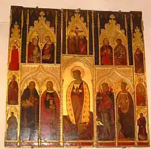 Les panneaux supérieurs illustrent des scènes de la vie de la Vierge Marie (mariage, Annonciation, Nativité, Assomption) encadrées des représentations de saint Pierre et de saint Paul ;
