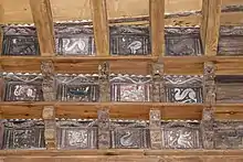 Les plafonds des galeries[10] offrent une collection de panneaux de bois peints des XIVe et XVe siècles[11], avec de jolies arcades retombant sur des colonnettes doubles.