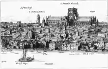 Le « vieux Saint-Paul » (Old St Paul's) tel qu’on nomme ce 4e édifice, était, avec ses 586 pieds (179 m), la troisième cathédrale la plus longue d'Europe et sa flèche culminait à 164 m[2]. Elle se dresse sur un vaste espace entouré de murailles qui suivent Creed Lane et Ave Maria Lane à l'ouest, Paternoster Row au nord, Old Change à l'est et Carter Lane au sud. Cette enceinte est alors percée de six portes.