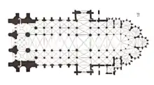 Puis, les trois travées les plus orientales de la nef sont construites du XIIIe siècle jusqu'au début du XIVe siècle. Cependant, le plan de construction de la nef s'écarte du plan originel du fait de l'adjonction aux collatéraux doubles de chapelles de faibles profondeurs. Cette modification rend nécessaire, pour le raccord de la nef au transept, la construction du mur en biais (visible sur le plan)[SB 3]. Vers 1310 la voûte du transept ainsi qu'une flèche élevée au-dessus de la croisée sont achevées[SB 3].