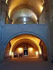 Au-delà des deux premières travées s'élève une haute voûte sobre caractéristique des constructions romanes, de 10 mètres de large pour près de 20 mètres de hauteur, avec des murs de 2 à 2,5 mètres d'épaisseur. La sobriété extrême du lieu est compensée par une grande qualité de maçonnerie. Une immense voûte en berceau légèrement brisée recouvre la nef. Elle est renforcée à chaque demi-colonne par des arcs doubleaux à triple rouleau. La toiture reposait directement dessus, sans charpente. Incrustés dans la voûte, quatre rangs d'urnes en céramique poreuse servent de drains d'assainissement.