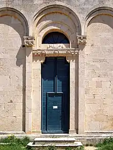 La façade occidentale est très proche en proportions avec celle de la Canonica ; mais elle en diffère par son ornementation plus élaborée et complexe. Elle présente en effet deux étages d'arcatures pleines, soutenues par des pilastres, montrant ainsi ses deux niveaux. Les chapiteaux sont sculptés d'animaux et de motifs végétaux stylisés. Une niche se trouve au-dessus des arcatures centrales. Comme cette église était à l'origine une cathédrale, son portail reflète par sa taille et par son décor, l'importance qu'elle avait au Moyen Âge. L'arc du tympan double et mouluré, est inscrit dans l'arcature centrale de la façade, lui donnant un aspect monumental. Le tympan est évidé. Le linteau monolithe, est orné de motifs géométriques gravés : trois séries de cercles concentriques, les intervalles occupés par diverses formes géométriques. Les chapiteaux qui l'entourent, sont sculptés d'un lion à gauche et de serpents à droite.