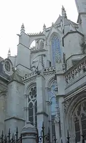 Extérieurement la nef est soutenue par des arcs-boutants à deux niveaux, de même type que ceux créés pour la première fois à la cathédrale de Soissons, et lui assurant une stabilité maximale. Le chaperon de chacun des arcs-boutants supérieurs est surmonté d'un pinacle à son sommet près de la nef. Il en est de même de chacune des culées.