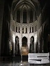 Le chœur de la cathédrale comporte également trois travées rectangulaires et une abside à cinq pans. Son élévation est à trois niveaux : grandes arcades communiquant avec le déambulatoire, triforium et fenêtres hautes. Il est entouré d'un large déambulatoire sur lequel s'ouvre la grande chapelle axiale hexagonale baroque de la Madeleine, devenue la chapelle Maes (XVIIe siècle). L'adjonction de deux vastes chapelles latérales au niveau de ce chœur (chapelle du Saint-Sacrement et chapelle Notre-Dame-de-la-Délivrance) a fait en sorte qu'il est devenu beaucoup plus large que la nef et même que le transept, bien que celui-ci ait été allongé, à la fin du XIVe siècle, par l'ajout d'un narthex à l'extrémité du croisillon sud.