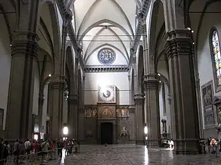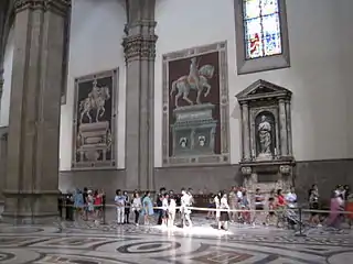 - Andrea del Castagno : fresques de la statue équestre de Niccolò da Tolentino sur les parois de la nef droite (1456), dans la seconde travée du collatéral nord après la porte des cornacchini[18] ; dessins de vitraux et de rosaces.