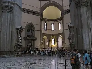 Santa Maria del Fiore (Sainte Marie de la Fleur) est l'une des plus vastes églises d'Europe : elle mesure 153 mètres de long et la coupole 41,98 mètres de diamètre intérieur. De plan basilical, elle comporte une nef à trois vaisseaux, un chevet à trois chapelles rayonnantes et un immense dôme dû à l'architecte Filippo Brunelleschi.