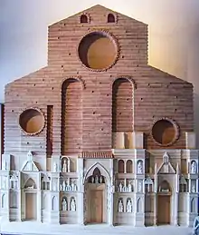 Selon la reconstruction proposée en 2005, à l'occasion d'une exposition temporaire au Museo dell'Opera, par Erica Neri et Silvia Moretti, la façade serait caractérisée, dans les niveaux supportés à leurs extrémités, par de grands prothyrons[3] suspendus surplombant les trois portails, suivis d'un bandeau de baies géminées à pinacles[4] qui simulaient une galerie ouverte ; des mosaïques dans le style des Cosmati, une nouveauté pour Florence, mais une constante dans l'œuvre d'Arnolfo, qui avait été en contact à Rome avec les familles des marbriers romains, ornaient le socle entre les trois portails, ainsi qu'une bande d'arcatures aveugles (retrouvées en partie en 1970 en enlevant quelques plaques réutilisées pour le pavement). Arnolfo installa une structure d'une échelle monumentale, qui culmina avec la décoration grandiose des grands tympans qui surplombent les entrées.
